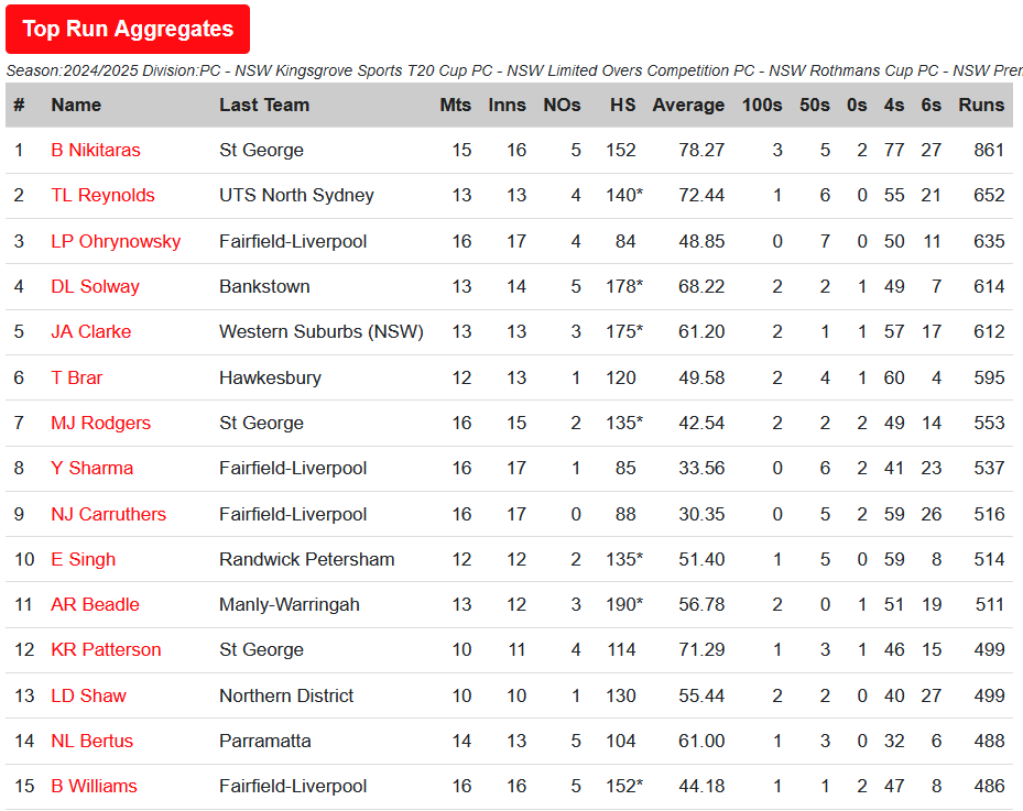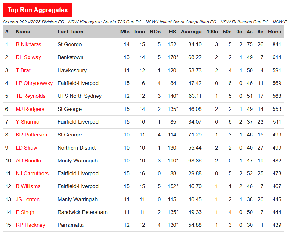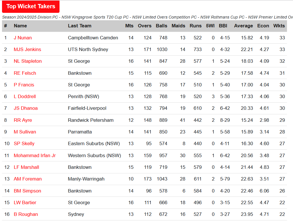 Uncategorized NSW Premier 1st Grade Leading Statistics 2024/25 December 15, 2024 actcricketstats Leave a comment The updated NSW Premier 1st Grade Statistics after the completion of yesterday’s round.