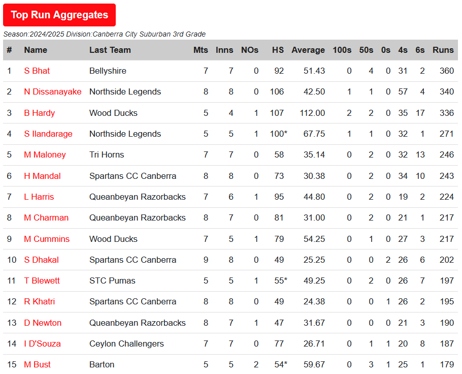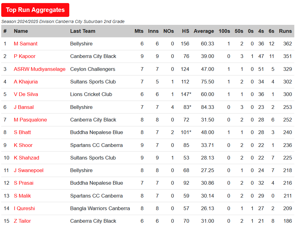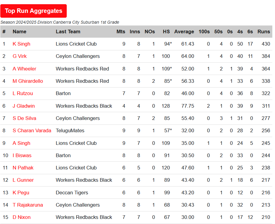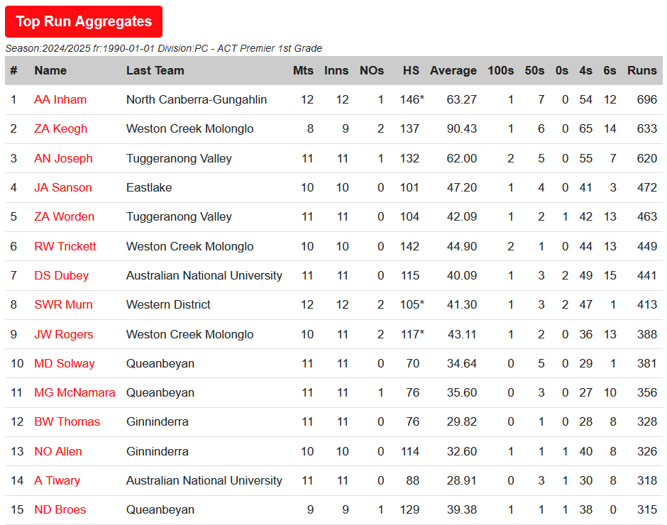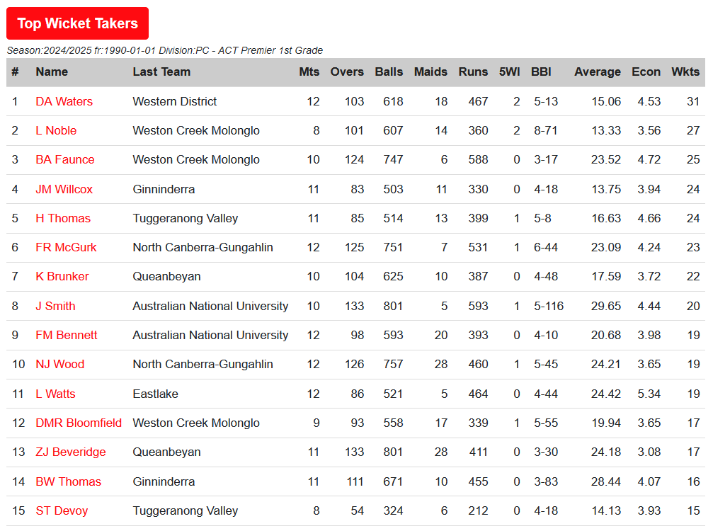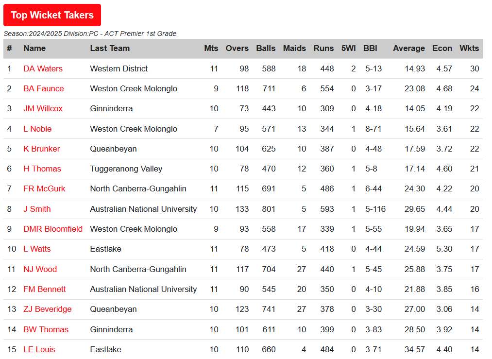 Uncategorized Leading ACT Premier 1st Grade Statistics 2024/25 December 15, 2024 actcricketstats Leave a comment The updated leading statistics after the completion of yesterday’s 1st Grade round.