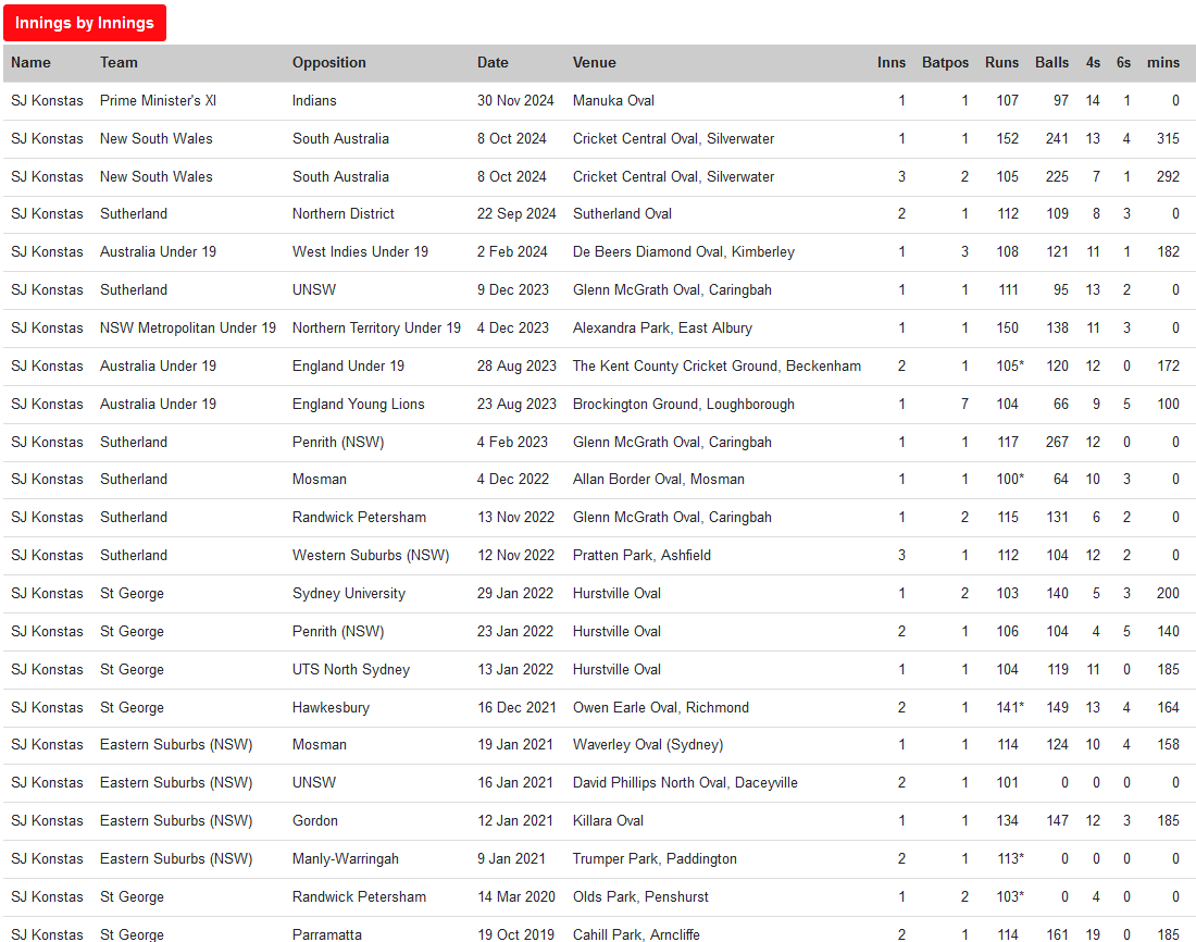 Uncategorized Hundreds by Sam Konstas December 24, 2024 actcricketstats Leave a comment With Sam Konstas set to debut in the Boxing Day Test Match at the Melbourne Cricket Ground, we look back at his 23 hundreds he has scored in his career so far