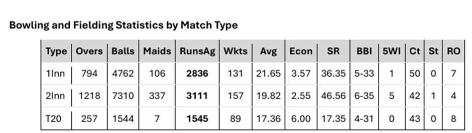 • Innings by Innings (Batting and Bowling)